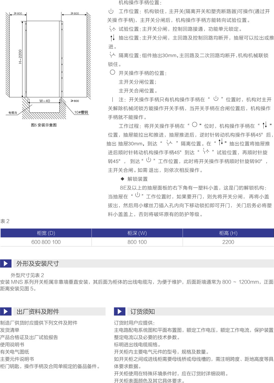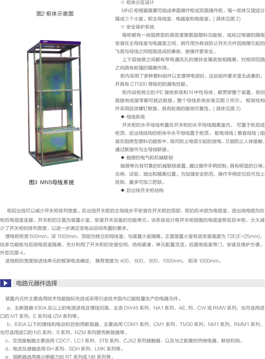 MNS型低压抽出式开关柜(以下称开关柜)是我公司参考了公司的MNS系列低压开关柜并加以综合改进后开发的,是目前国内较的低压抽出式开关设备。该产品由标准化的、成系列的模块组成,并且抽屉具有可靠的机械联锁装置,使用户在使用时更安全、更可靠。