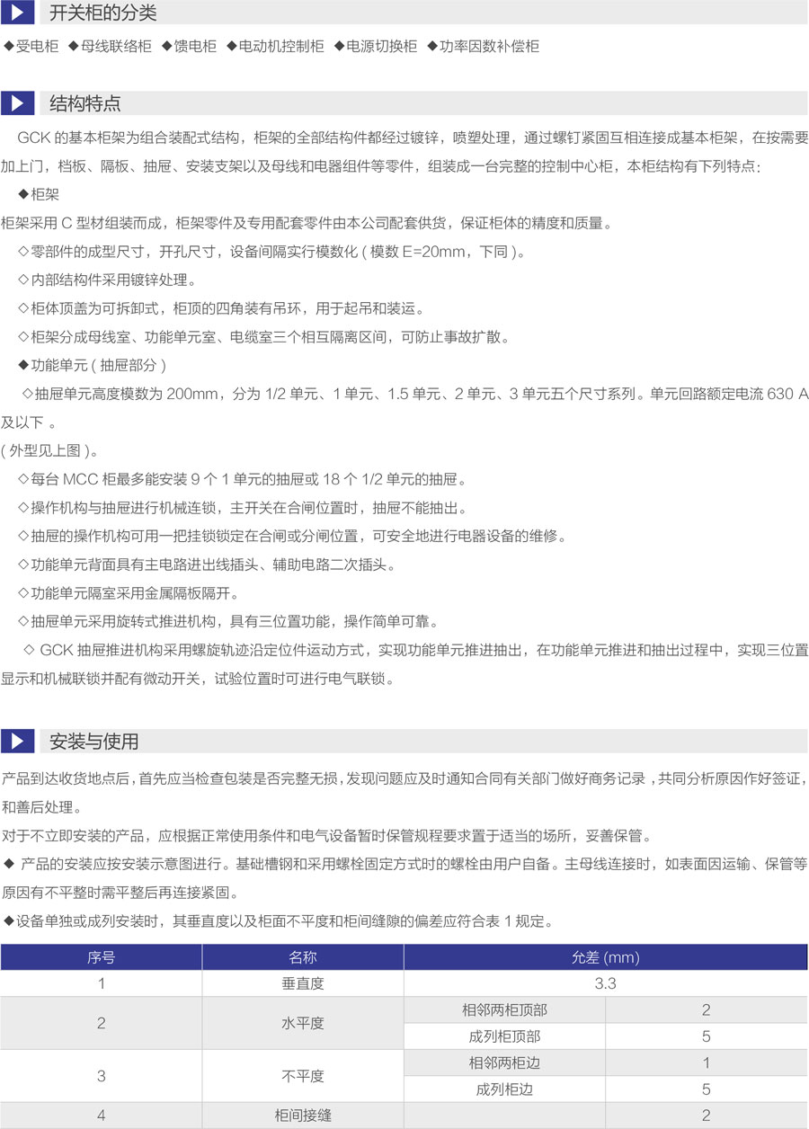 GCK是经过全面型式试验,是组装而成的低压开关柜,设计符合下列标准:国家标准GB7251.1-2005《低压成套开关设备》;