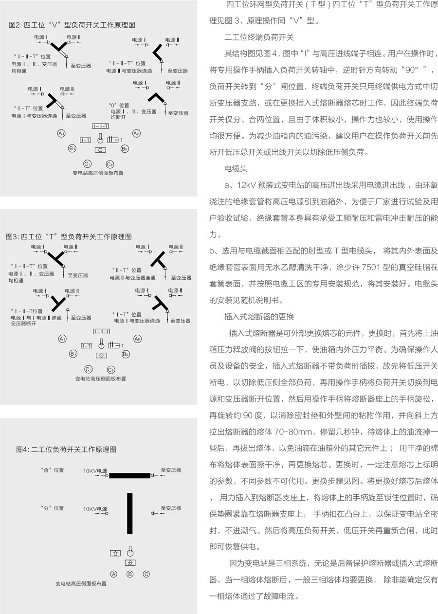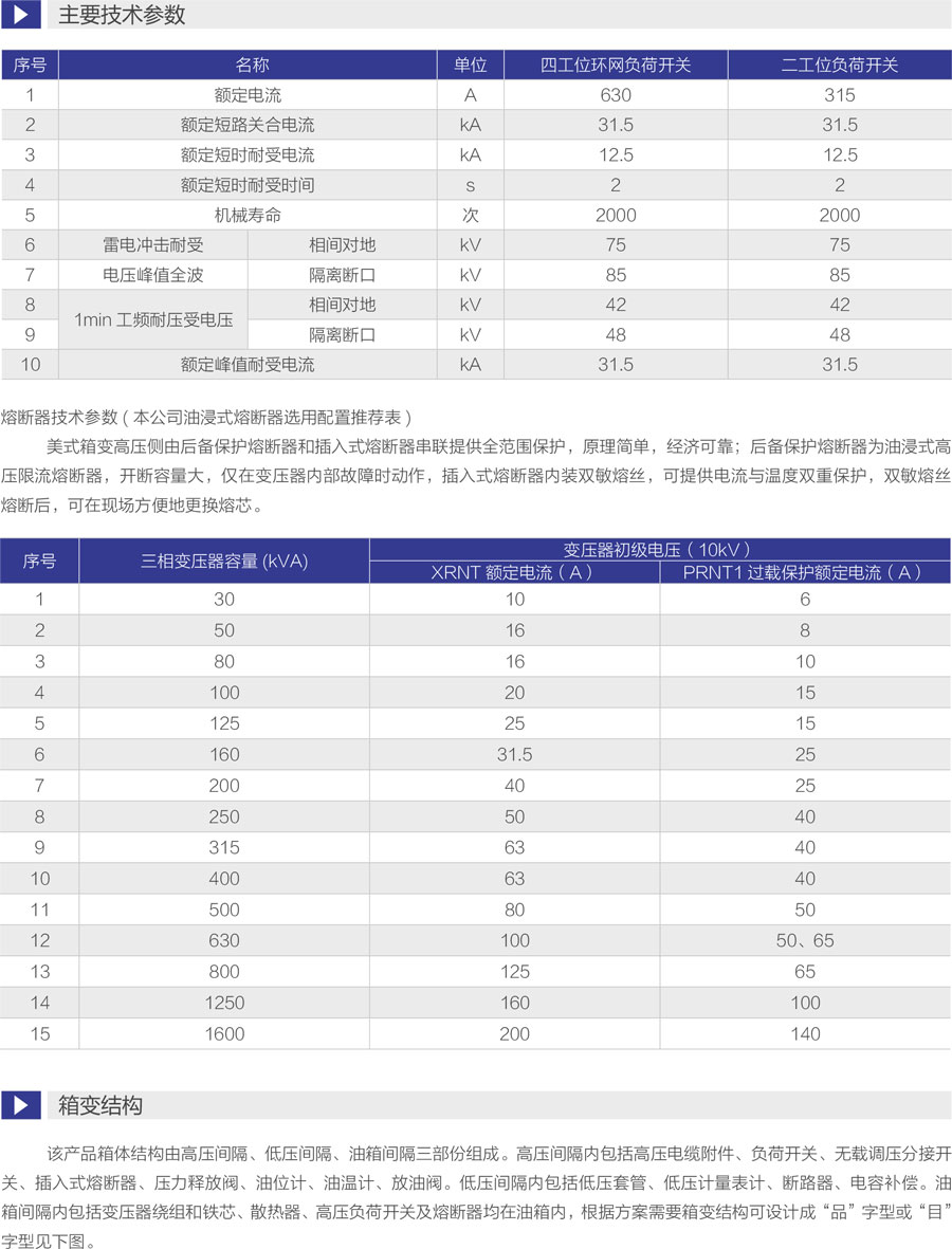 该产品箱体结构由高压间隔、低压间隔、油箱间隔三部份组成。高压间隔内包括高压电缆附件、负荷开关、无载调压分接开关、插入式熔断器、压力释放阀、油位计、油温计、放油阀。低压间隔内包括低压套管、低压计量表计、断路器、电容补偿。油箱间隔内包括变压器绕组和铁芯、散热器、高压负荷开关及熔断器均在油箱内,根据方案需要箱变结构可设计成“品”字型或“目”字型见下图。