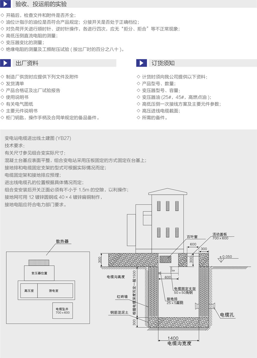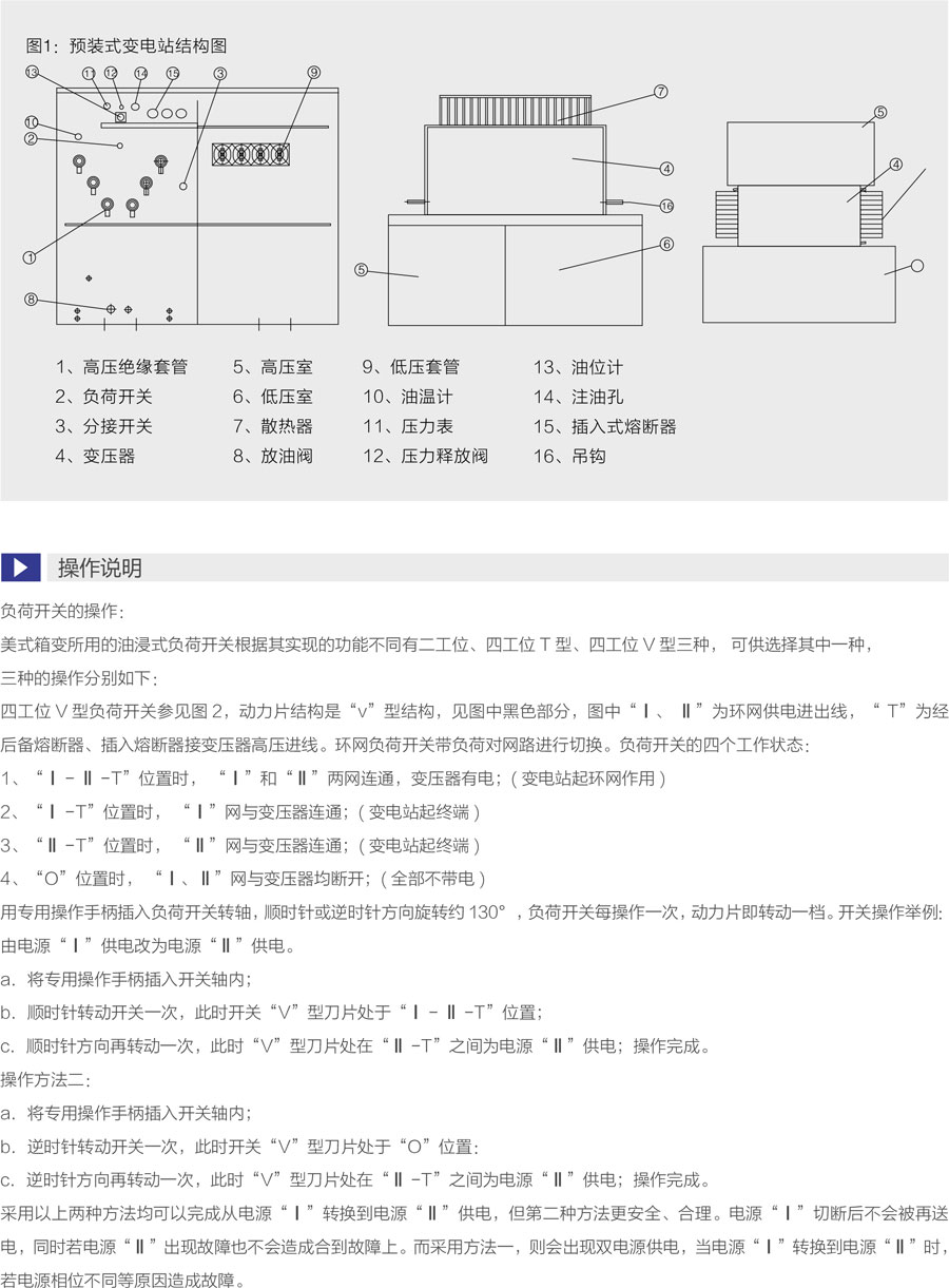 本产品是结合国内实际情况研制开发的,整台产品具有体积小、安装维护简便、低噪音、低损耗、防盗、过负荷能力强、全保护等特点。适用于新建小区、绿化带、公园、车站宾馆、工地、机场等场所。本产品符合下列标准: GB/T17467- 1998《高压低压预装式变电站》、DL/T537-93 《6-35kV箱式变电站订货技术条件》