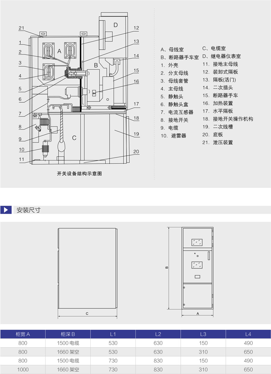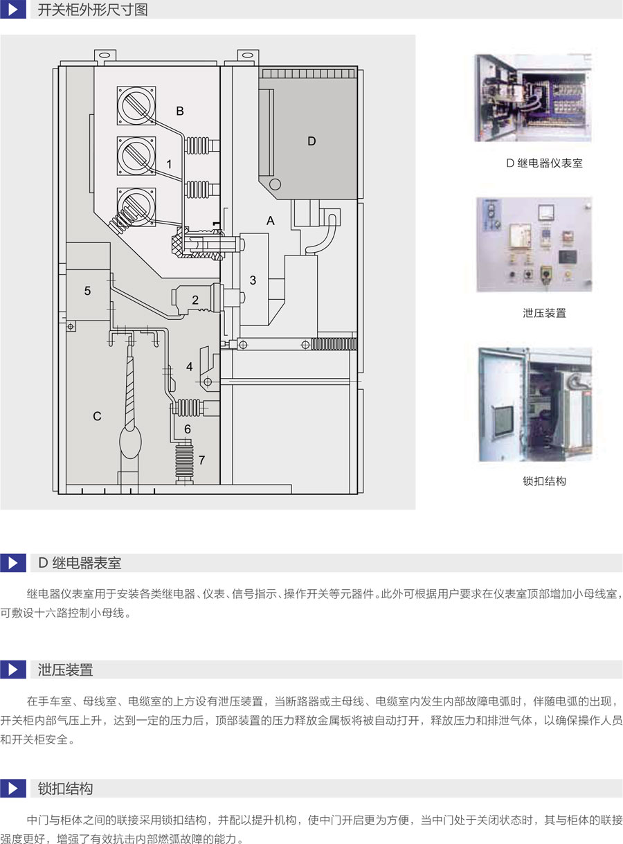 开关设备按GB3906-91中的铠装金属封闭开关设备而设计。整体是由柜体和中置式可抽出部件(即手车)两大部分组成(见图)。柜体分四个单独的隔室,外壳防护等级为IP4X,各小室间和断路器室门打开时等级为IP2X。具有架空进出线、电缆进出线及其它功能方案,经排列、组合后形成一-套完整的配电系统装置。本开关设备可以从正面进行安装、调试和维护,因此它可以背靠背、组成双重排列和靠墙安装,提高了开关设备的安全性、灵活性、减少了占地面积。