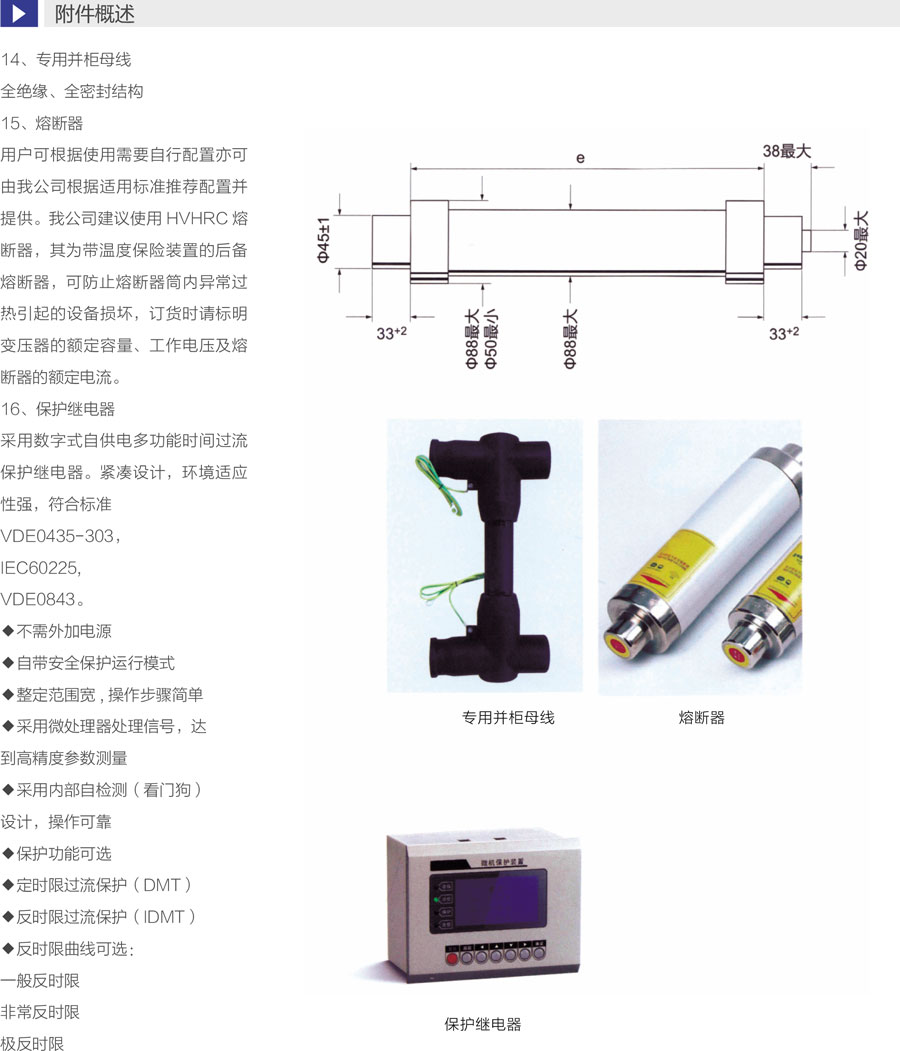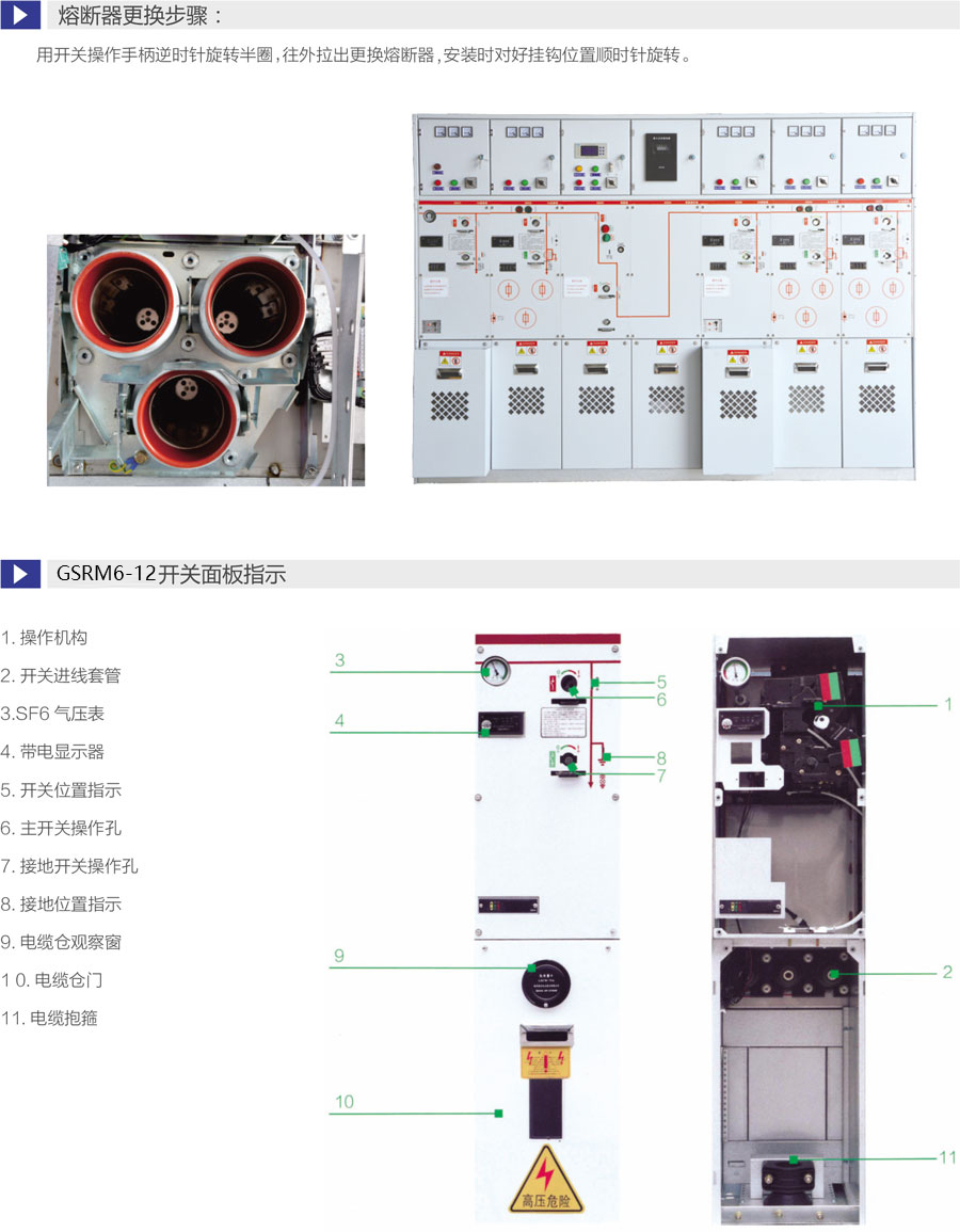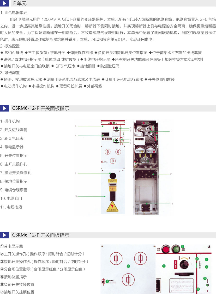断路器采用负荷开关替代隔离开关,更安全可靠 ,一次侧全密闭设计提供意外接触的保护满足五防要求的机械联锁带电显示器可提供进出线路带电指示运行可靠:全密闭设计,所有10kV开关及母线带电体均密封在3mm不锈钢板焊接成的气箱中;配硅橡胶电缆插头,实现电缆头全绝缘全密封,从而不受灰尘、潮湿、小动物等外界环境影响弹簧储能操作机构,可人工或电动操作面板模拟线图提供开关位置指示柜体用镀锌板制作,表面静电喷涂,增强抗腐蚀性能压力表监视箱体内SF6气体安全压力范围。