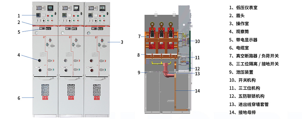 主回路采用三工位开关(接通+隔离+接地)和真空灭弧室组合,该结构是目前技术成熟的配置方式,适合目前电网运行维护需求。