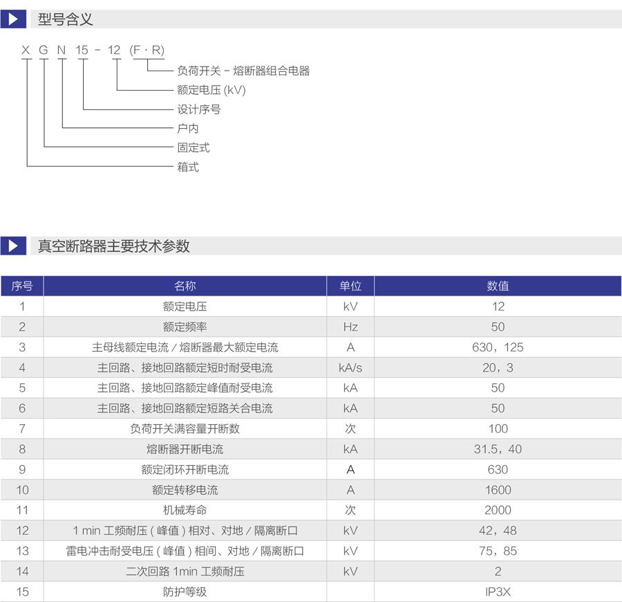 XGN15- 12型单元式交流金属封闭环网开关设备,适用于交50Hz、12kV的电力网络中,作为电能的接受和分配用。柜内主开关为SF6开关。