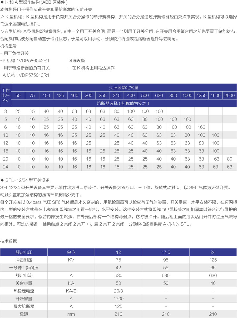 环网柜的主开关、操作机构及元器件采用A B B公司原装件或采用进口部件国内组装生产的SFL-12/24型开关设备,也可根据用户需要配装公司原装HAD/US型SF6。断路器或VD4-S型真空断路器。其操作方式分为动、电动两种。